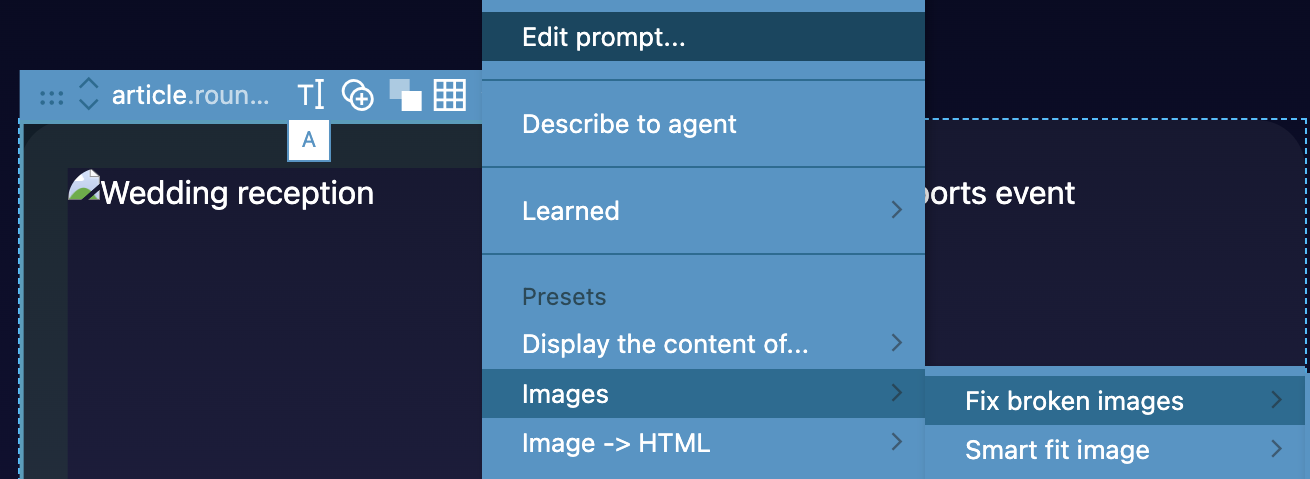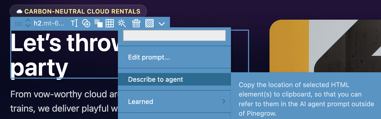 Describe to agent – Copy the location of selected HTML element(s) to clipboard, so that you can refer to them in the AI agent prompt outside of Pinegrow.