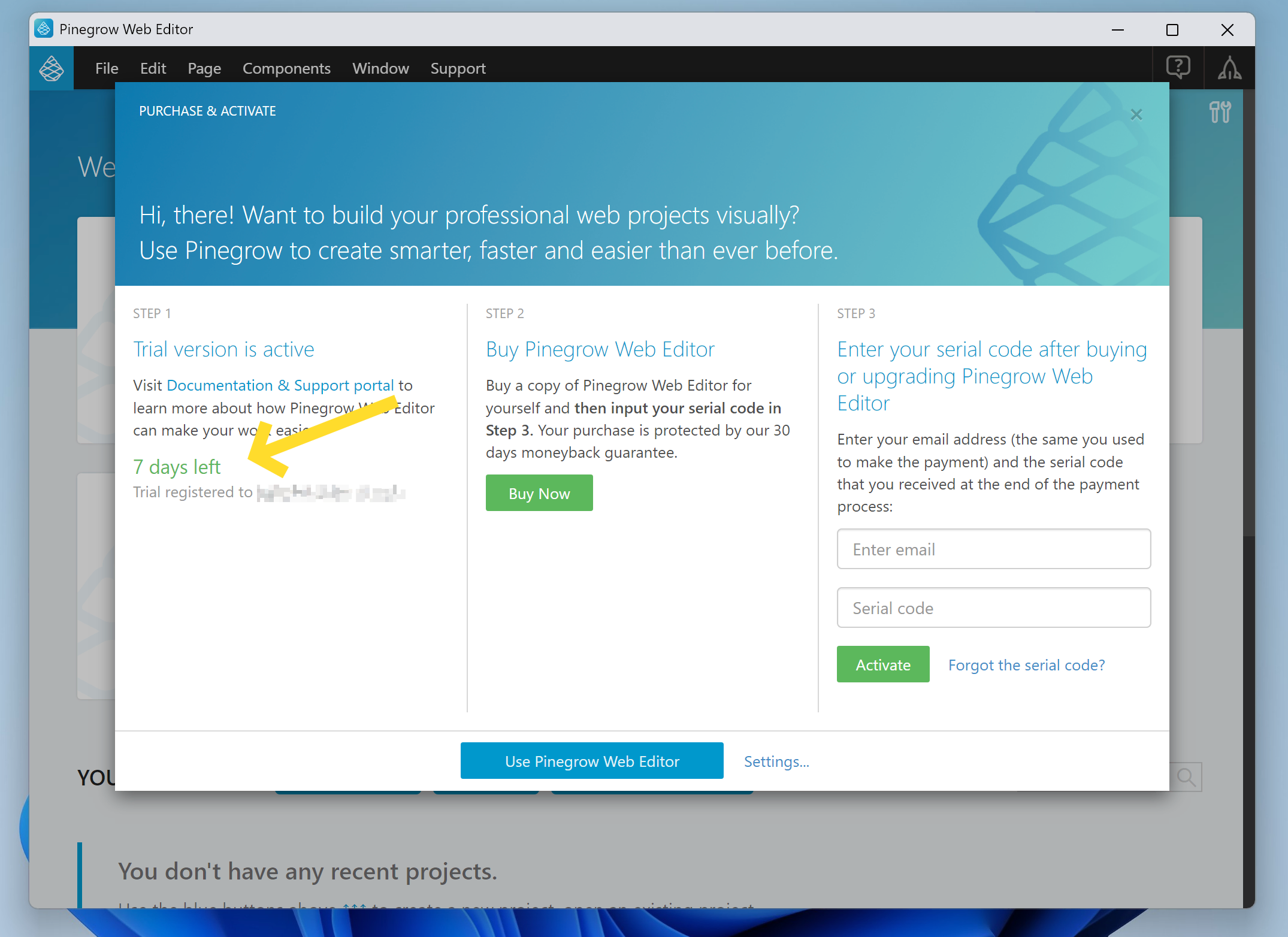 - You can see how many days are left in your trial every time you open Pinegrow, and you can also check it right in the interface under the Purchase & Activate section.